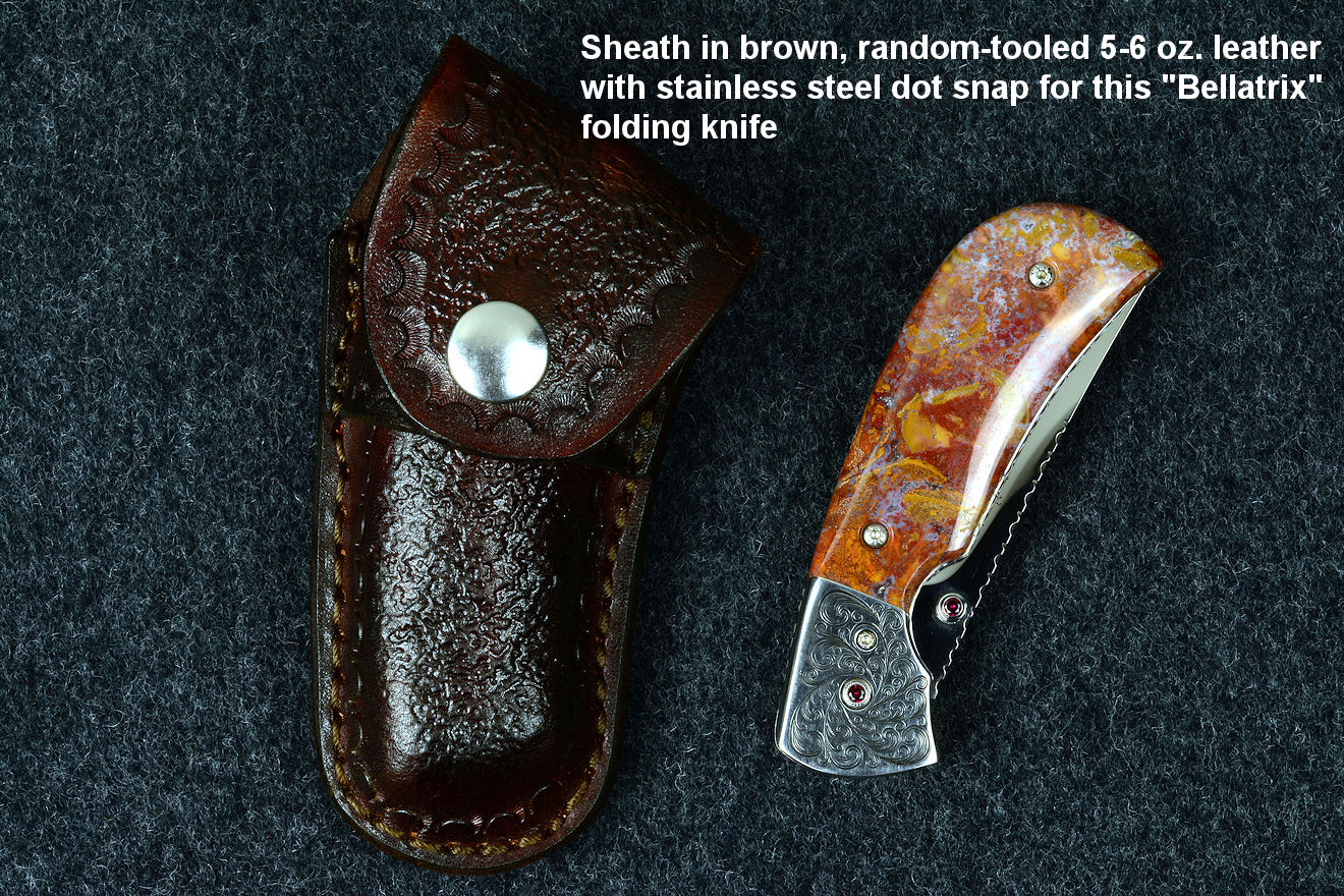 "Pallene" obverse side view in CPM154CM high molybdenum powder metal technology tool steel blade, hand engraved, with hand-engraved 304 stainless steel bolsters, Brecciated Jasper gemstone handle, and a sheath of hand-carved leather inlaid with rayskin