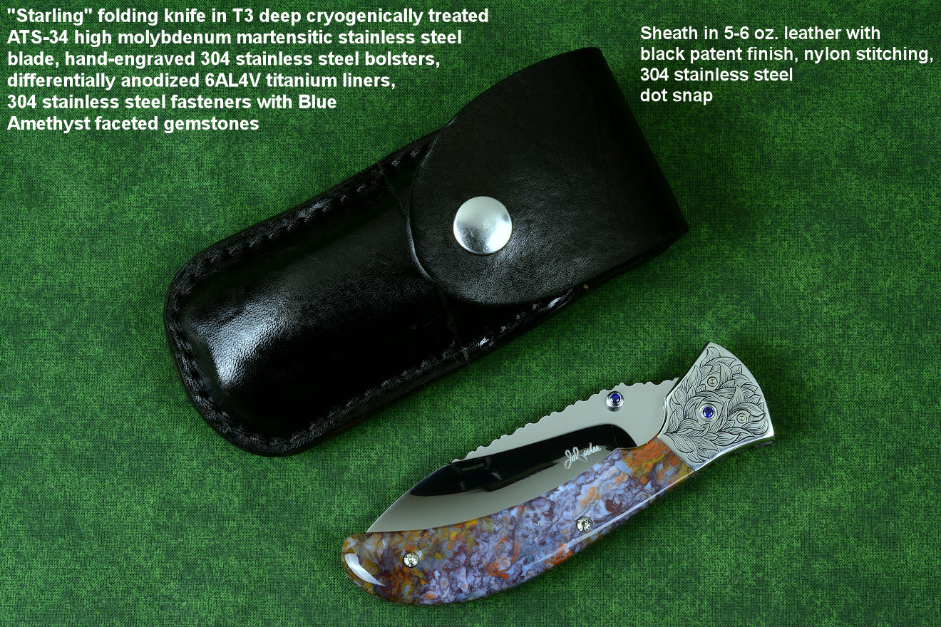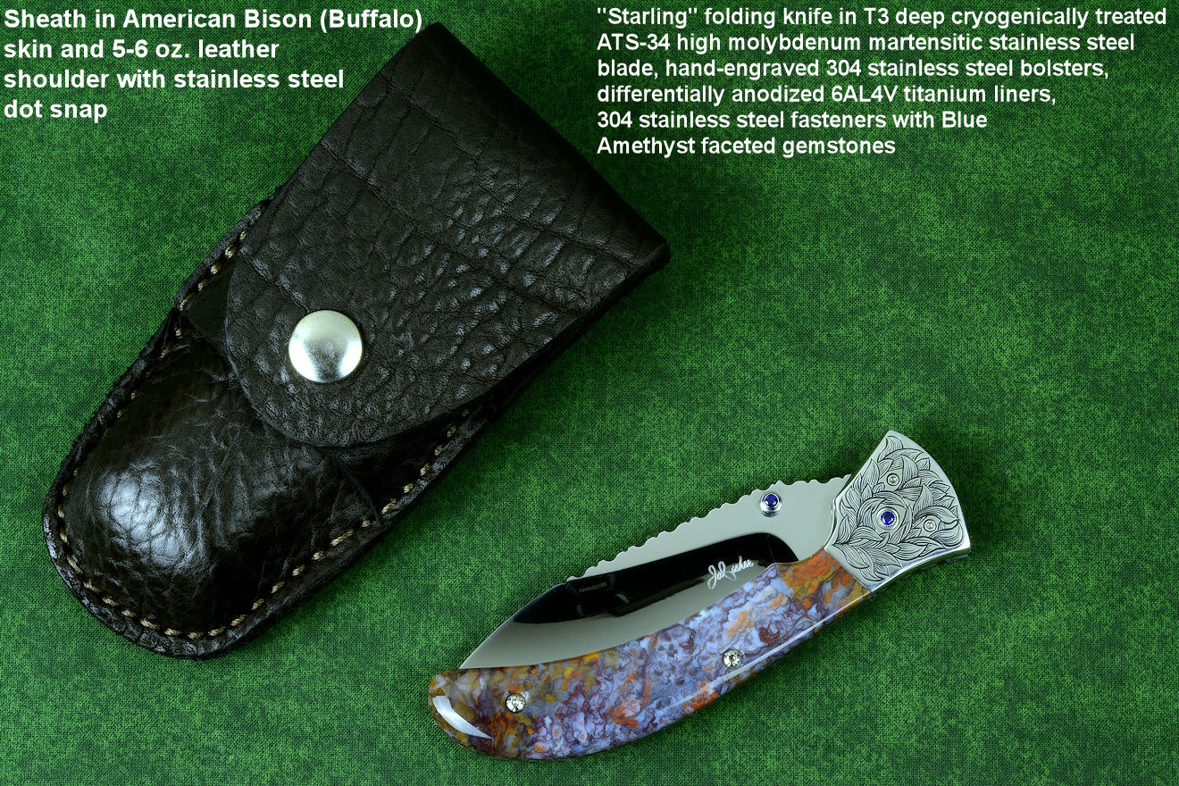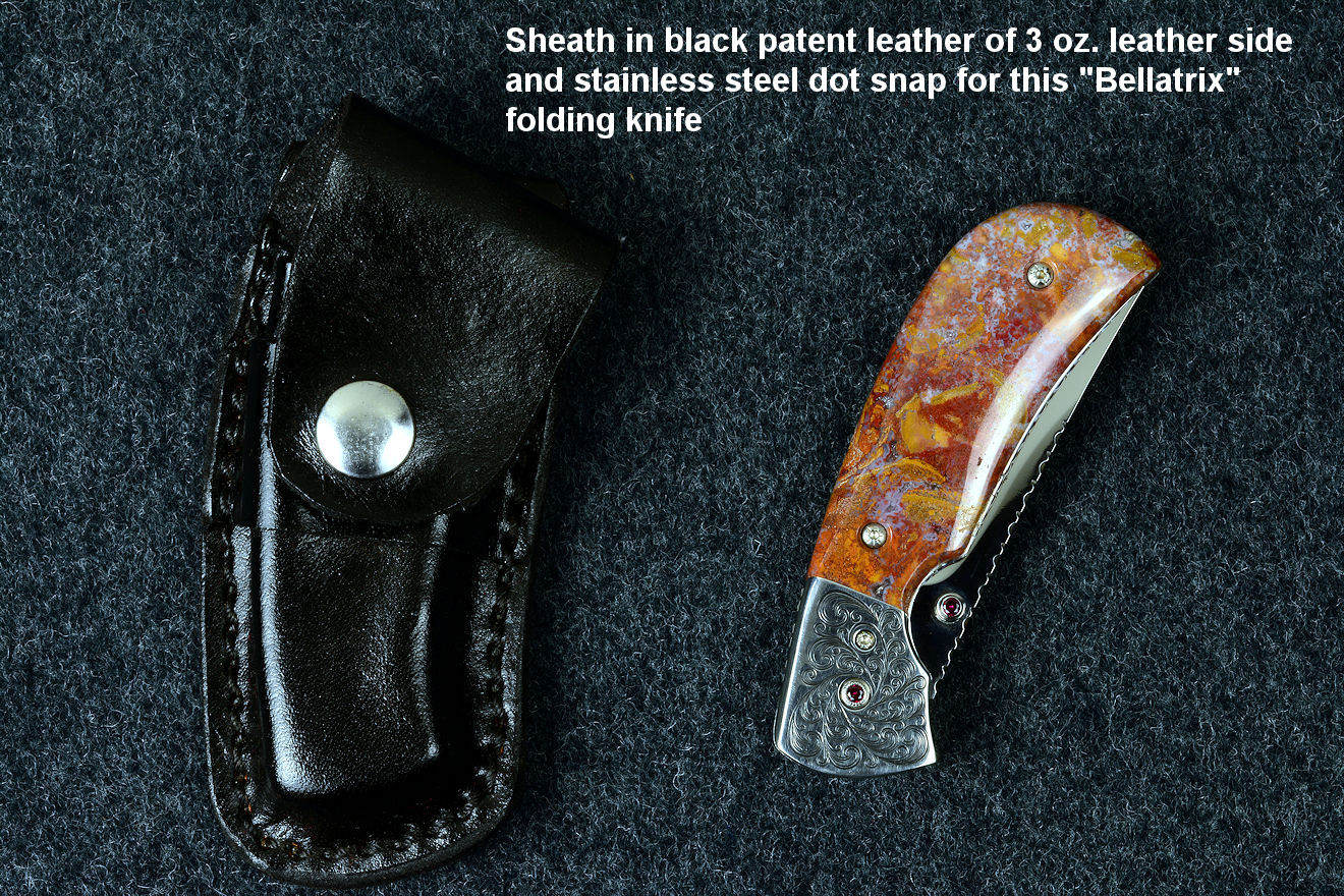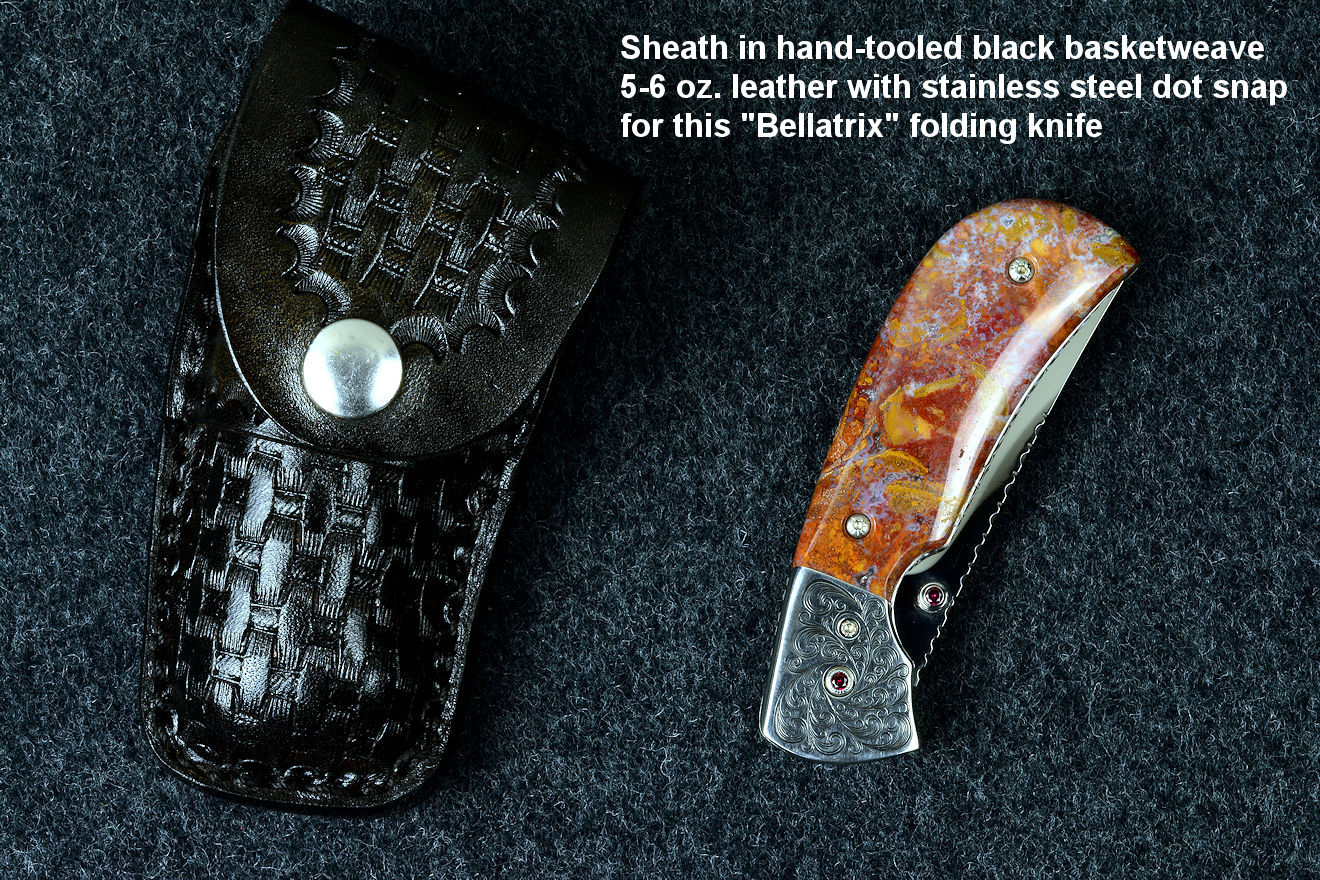 The knife is an amazing recreation of a vision upon which we collaborated to the “T.” I looked at every seam and joint with 3.5X loupe magnification..polish and fit are amazing (not a space or rough spot anywhere, stone color is dramatic and the dovetail fittings are for me technically unimaginable (except that I have it here real-time in my hands), the sheath is a real work of art…the stitching and leather selection are so well constructed and the edges are solid and even. This specimen and leather selection is a real work of art.