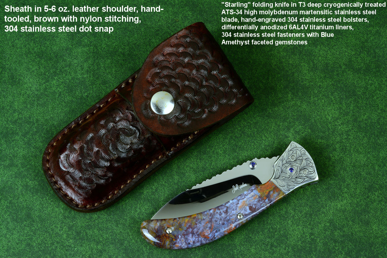 "Astarion" 440C stainless tool steel blade, hand-engraved 304 stainless steel bolsters, jade and agate gemstone handle, ostrich skin inlaid in hand-tooled leather sheath